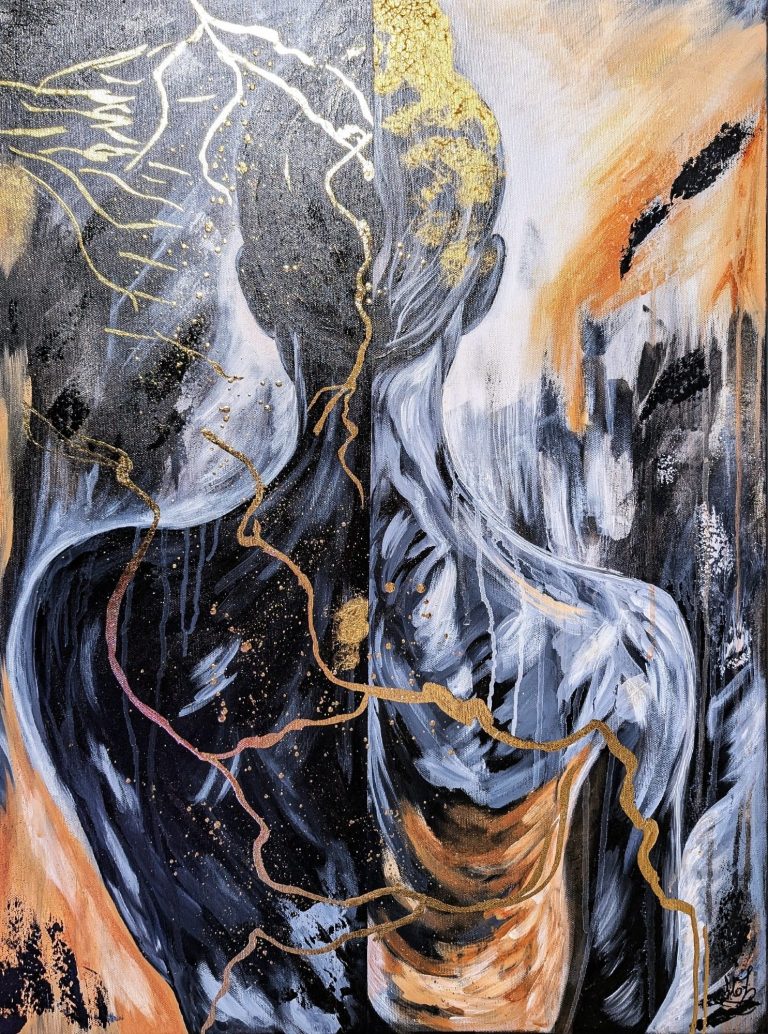 Inspiriert von der japanischen Tradition des Kintsugi, bei der zerbrochene Keramik mit Gold gekittet wird, begreift dieses Werk psychologische Brüche nicht als Defekt. „Golden Burden“ visualisiert den Moment der Transformation: Wenn Schmerz und Last angenommen werden, entsteht eine neue, unverwechselbare Stärke. Die physische Schwere der Textur kontrastiert mit der spirituellen Leichtigkeit des Goldes. Ein Spannungsfeld, das den Betrachter einlädt, die eigene Geschichte als Ort des Wachstums zu begreifen.